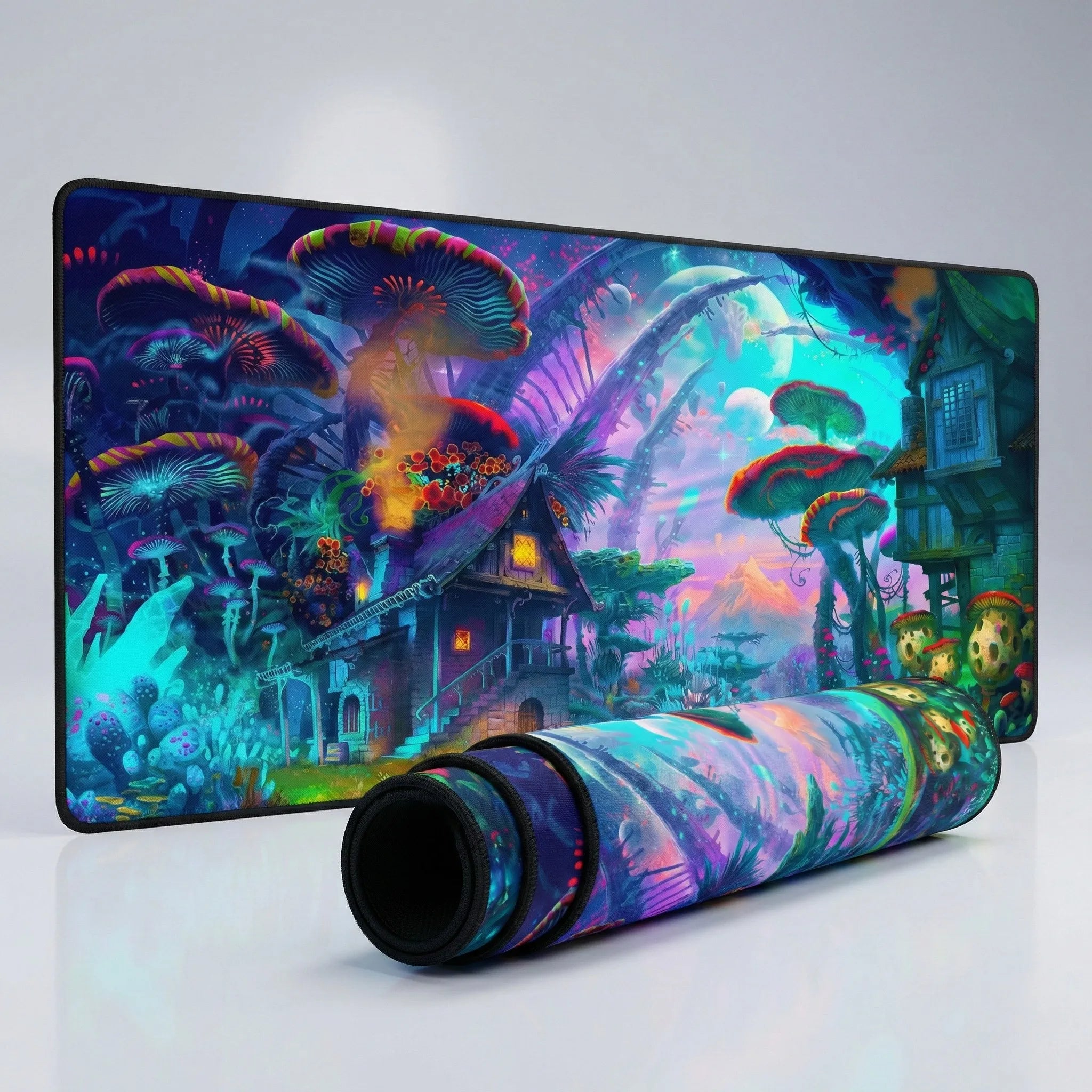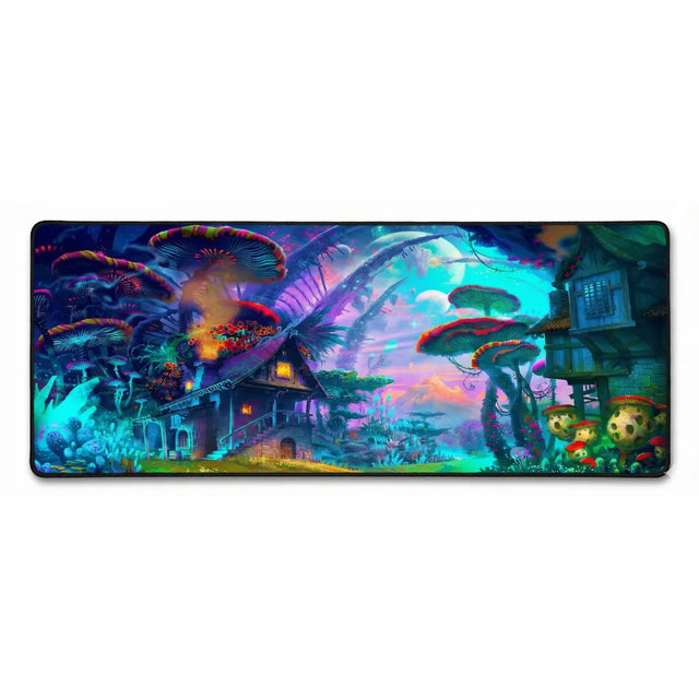 Transformez votre espace de travail en un portail vers l'imaginaire absolu. Plus qu'un simple accessoire, ce tapis de souris est une véritable fenêtre ouverte sur une forêt enchantée, où des champignons bioluminescents géants côtoient des chaumières de pierre sous un ciel aux lunes multiples. Ses couleurs néon vibrantes — bleus électriques, violets profonds et oranges incandescents — insufflent une magie narrative et une énergie visuelle spectaculaire à votre setup.