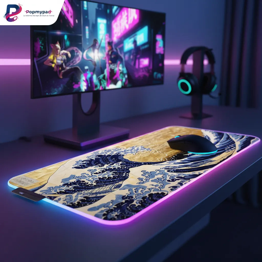 Plongez au cœur d'une œuvre légendaire où la puissance brute de l'océan rencontre le raffinement absolu de l'or. Ce tapis de souris n'est pas qu'un simple accessoire, c'est une pièce de collection qui transforme votre bureau en une galerie d'art privée. Entre les nuances profondes du bleu de Prusse et les reflets d'un fond texturé à la feuille d'or, chaque mouvement de votre main devient un voyage sensoriel entre tradition nippone et modernité.