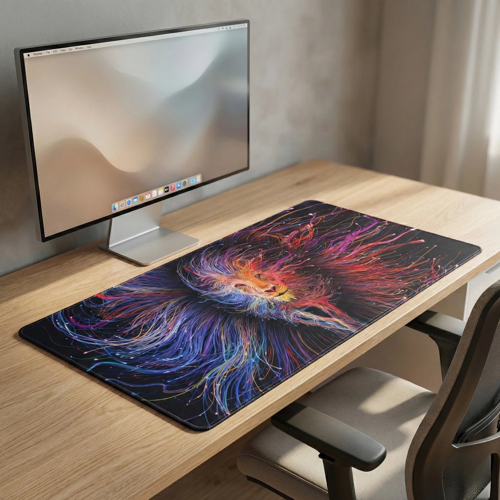 Plongez dans un univers où la force brute rencontre la poésie numérique. Ce tapis de souris arbore une illustration fascinante d'un lion souverain, dont la crinière semble tissée de fils de lumière électriques et de néons vibrants. Entre énergie chromatique et profondeur abyssale, il transforme votre bureau en une véritable galerie d'art, apportant une aura de puissance et de sérénité à vos sessions de jeu ou de création.