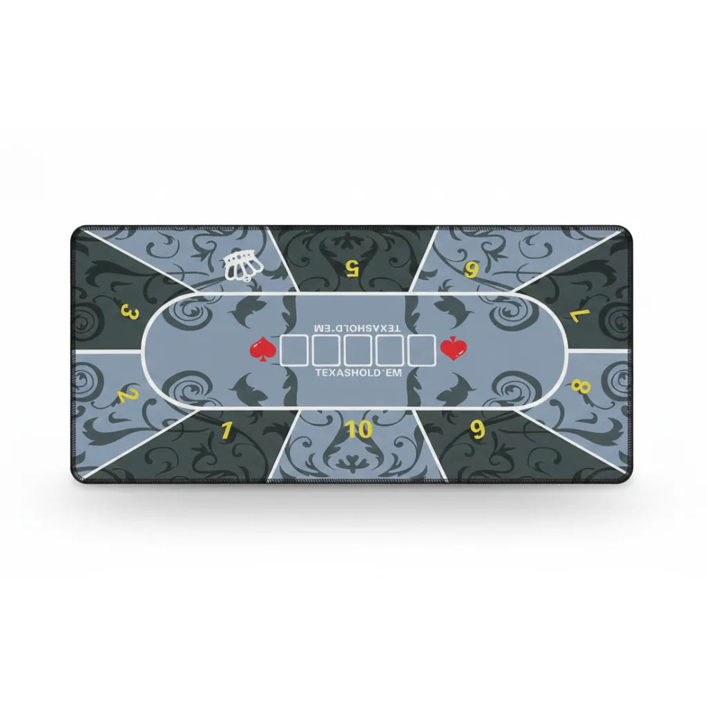 Plongez dans l'atmosphère feutrée des plus grands cercles de jeu avec ce tapis de souris d'exception. Mêlant l'élégance intemporelle des motifs damassés à la rigueur stratégique du Texas Hold'em, il transforme votre bureau en une véritable arène de maître. Ses nuances de gris bleuté et ses détails numérotés apportent une profondeur esthétique et une aura de mystère à votre setup, qu'il soit dédié au travail ou à la compétition.