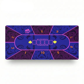 - 🎨 Design Somptueux et Immersif : Une illustration intégrale de table de "Texas Hold'em", mêlant motifs classiques profonds et une palette vibrante de bleus, pourpres et roses. L'impression haute définition révèle chaque détail royal.