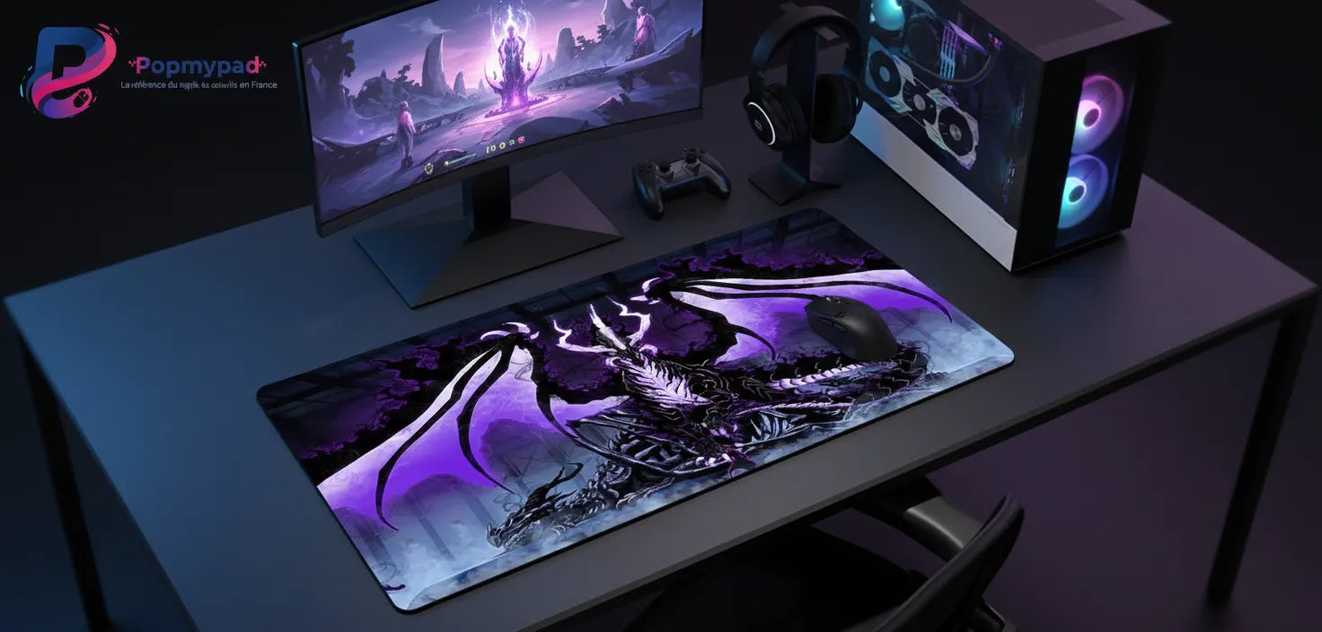 Redonnez vie à la légende avec ce tapis de souris d'exception mettant en scène le dragon spectral des ombres. Sous vos mains, l'obscurité s'anime d'un violet électrique vibrant, créant une atmosphère de conquête et de puissance absolue. Que vous soyez en plein combat ou en pleine création, ce design majestueux insuffle une énergie nouvelle à votre setup gaming.