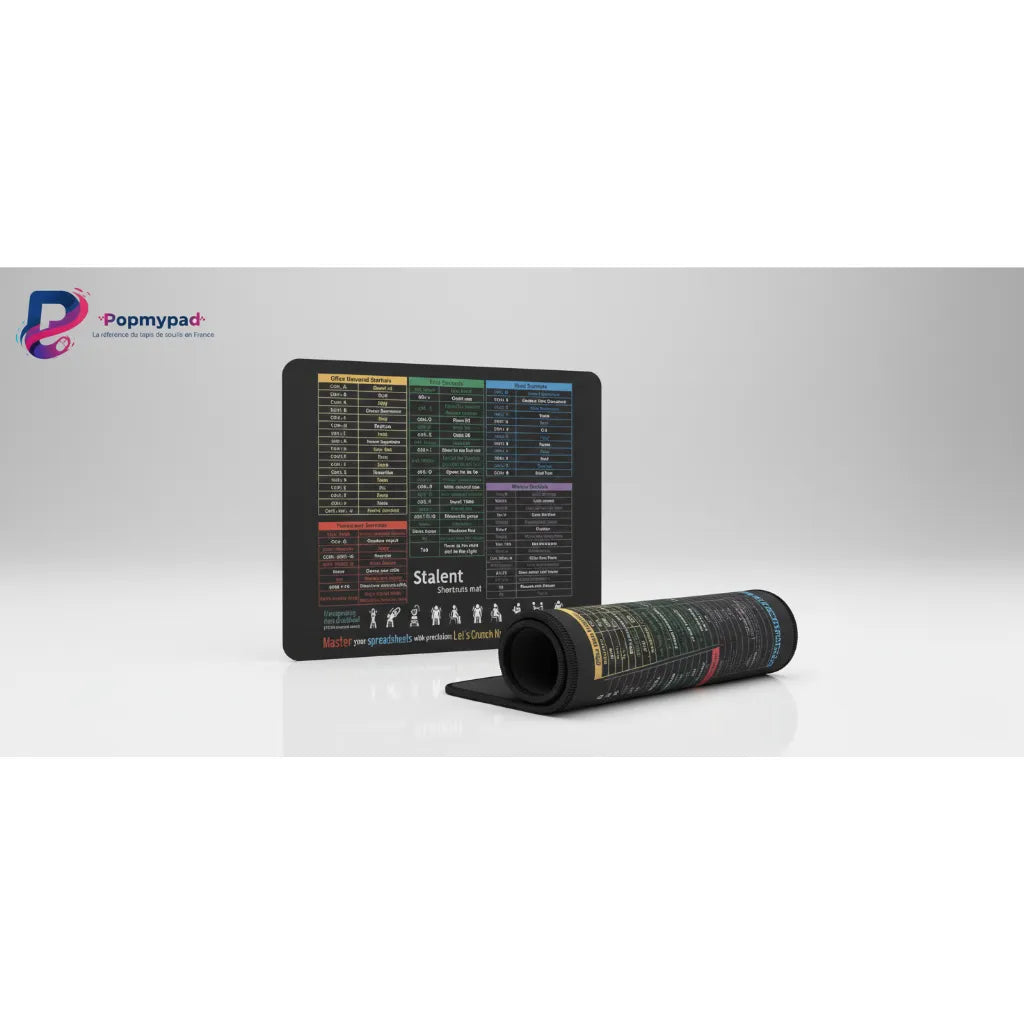 Plongez dans une atmosphère de travail sereine et ordonnée avec le tapis de souris Stalent. Ce modèle unique allie une esthétique sobre à une utilité quotidienne grâce à ses tableaux de raccourcis logiciels (Office, Excel, Word) élégamment intégrés sur un fond sombre. Il ne se contente pas de protéger votre bureau, il devient un véritable assistant visuel pour un flux de travail fluide et sans interruption.
